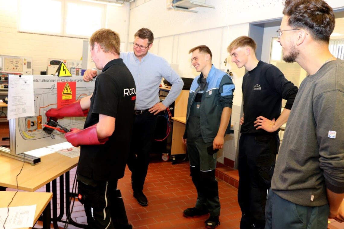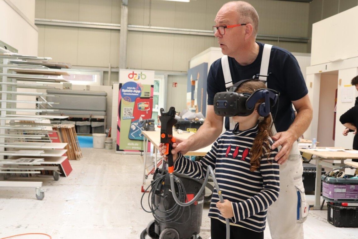 Die digitale Lackierpistole mit VR-Brille kam in der Malerhalle beim Nachwuchs gut an. Lehrwerksmeister Wolfgang Post zeigte den Gästen die Funktionsweise.