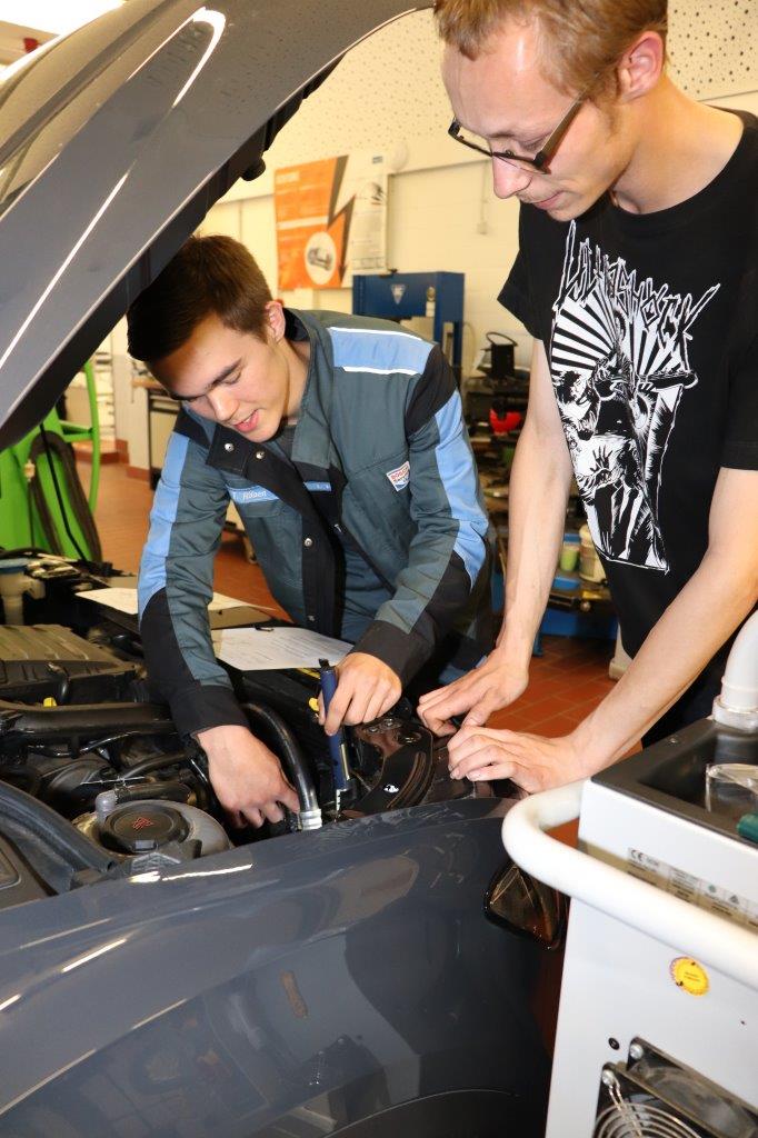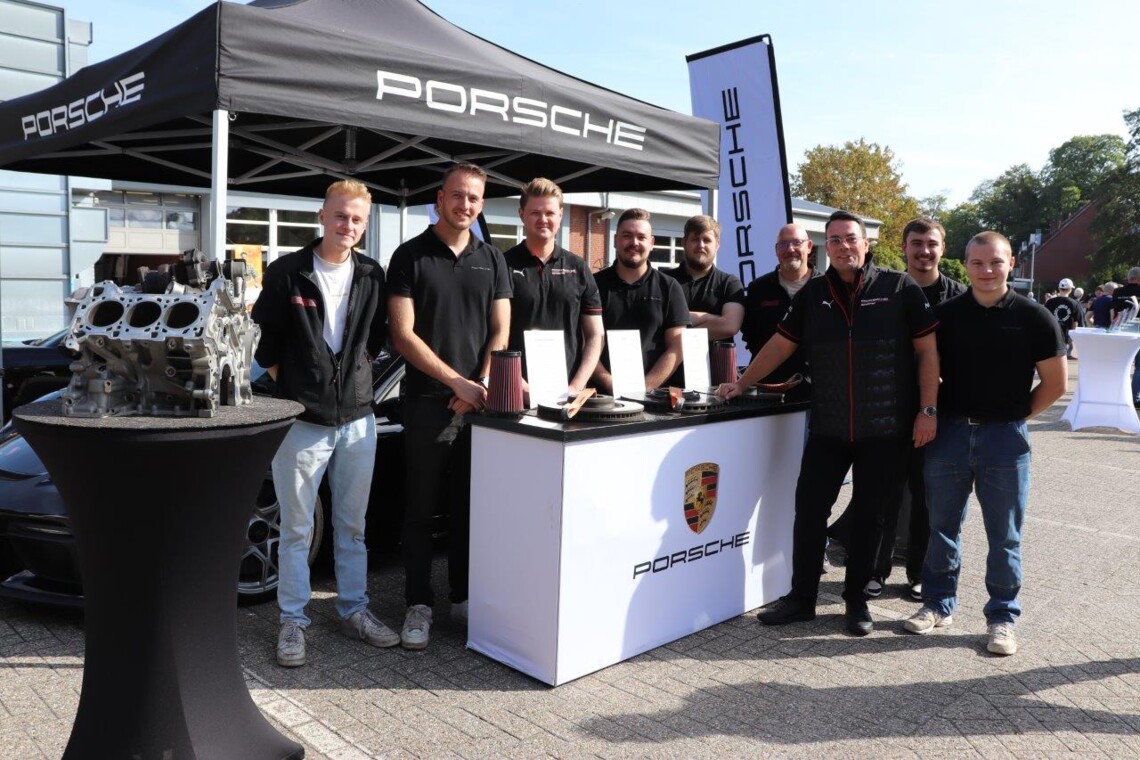 In der Kfz-Halle waren die Azubis der Berufsbildenden Schule Norden auch Feuer und Flamme für die Motorentechnik. So wurde an einer Übungstafel für Hochvoltsysteme demonstriert, wie ein Elektroauto von der Spannung freigeschaltet wird. Das wurde dann auch direkt unter der Motorhaube eines Fahrzeugs von Tobias Röben aus Westersander vom Ausbildungsbetrieb Bosch Freese (Aurich) erläutert. Wer von Motoren dann noch nicht genug hatte, konnte auf dem großen Gelände die Fahrer des Porscheclubs Ostfriesland e.V. und das Team des zukünftigen Porschezentrums Leer zu den ausgestellten Sportwagen wie Porsche Spyder RS oder Porsche 911 GT3 Touring interviewen.