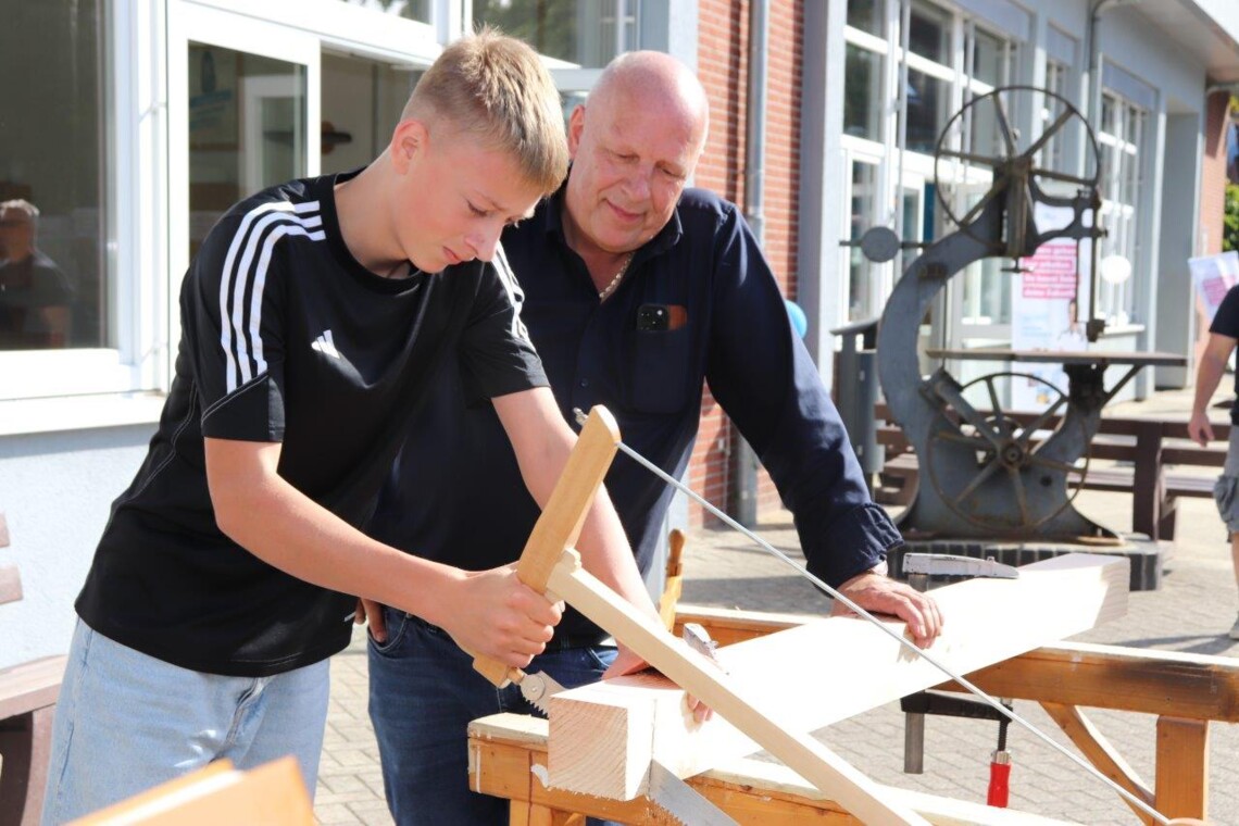Bei den Tischlern war Muskelkraft gefragt. Unter Anleitung von Obermeister Wilhelm Eden von der Tischerinnung Leer wurde per Hand gesägt.