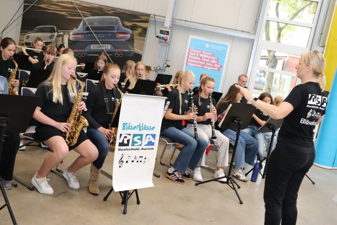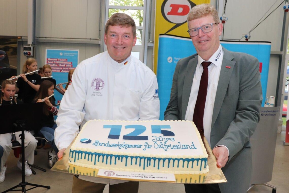 Er lud die Gäste ein, die Gewerke mit allen Sinnen zu erkunden: Angefangen mit der Verköstigung der Jubiläumstorte, meisterhaft kreiert von Jörg Tapper, Obermeister der Konditoren-Innung für Ostfriesland. Süße Spezialitäten gab es außerdem von Konditormeisterin Sarah Schweerke von der Konditorei Moorgold in Walle. Musikalisch eröffnete die Bläserklasse der Realschule Aurich das Fest, gefolgt von dem Sänger und Gitarristen Thomas Kümper.
