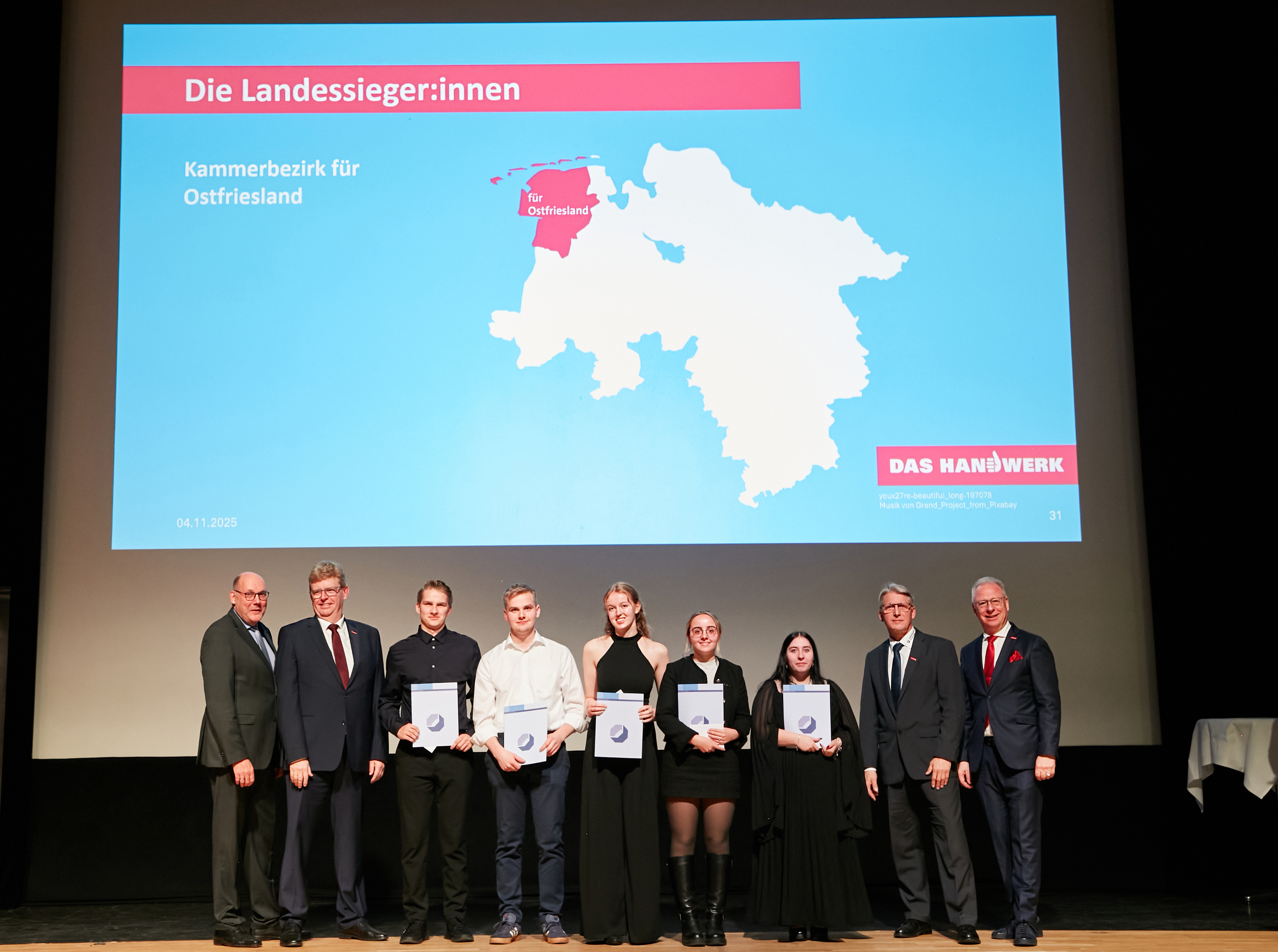Celle/Ostfriesland. Hände, die Zukunft schaffen, Köpfe, voller Ideen und Herzen, die für ihr Handwerk schlagen. Was mit Neugier und Begeisterung begann, endete auf der großen Bühne: Drei Gesellinnen und fünf Gesellen aus Ostfriesland holten in diesem Jahr den Landessieg bei der „Deutschen Meisterschaft im Handwerk – German Craft Skills (DMH)“ nach Hause. Zuvor sicherten sie sich erst den Sieg auf Kammerebene und setzten sich anschließend beim Entscheid auf Landesebene erneut gegen ihre Fachkonkurrenz durch. Dafür wurden sie vergangene Woche im Rahmen eines Festaktes in der Congress Union in Celle gefeiert – und mit ihnen all die Träume, das Durchhaltevermögen und die Leidenschaft, die hinter jeder einzelnen Erfolgsgeschichte standen. „Sie sind der Beweis dafür, dass das Handwerk Zukunft hat – und dass Begeisterung, Fleiß und Herzblut am Ende immer belohnt werden! Gleichzeitig sind Sie Vorbilder für eine ganze Generation und das beste Aushängeschild für unsere Ausbildungsbetriebe in Ostfriesland“, gratulierte Albert Lienemann, Präsident der Handwerkskammer für Ostfriesland, den Siegerinnen und Siegern sichtlich stolz.