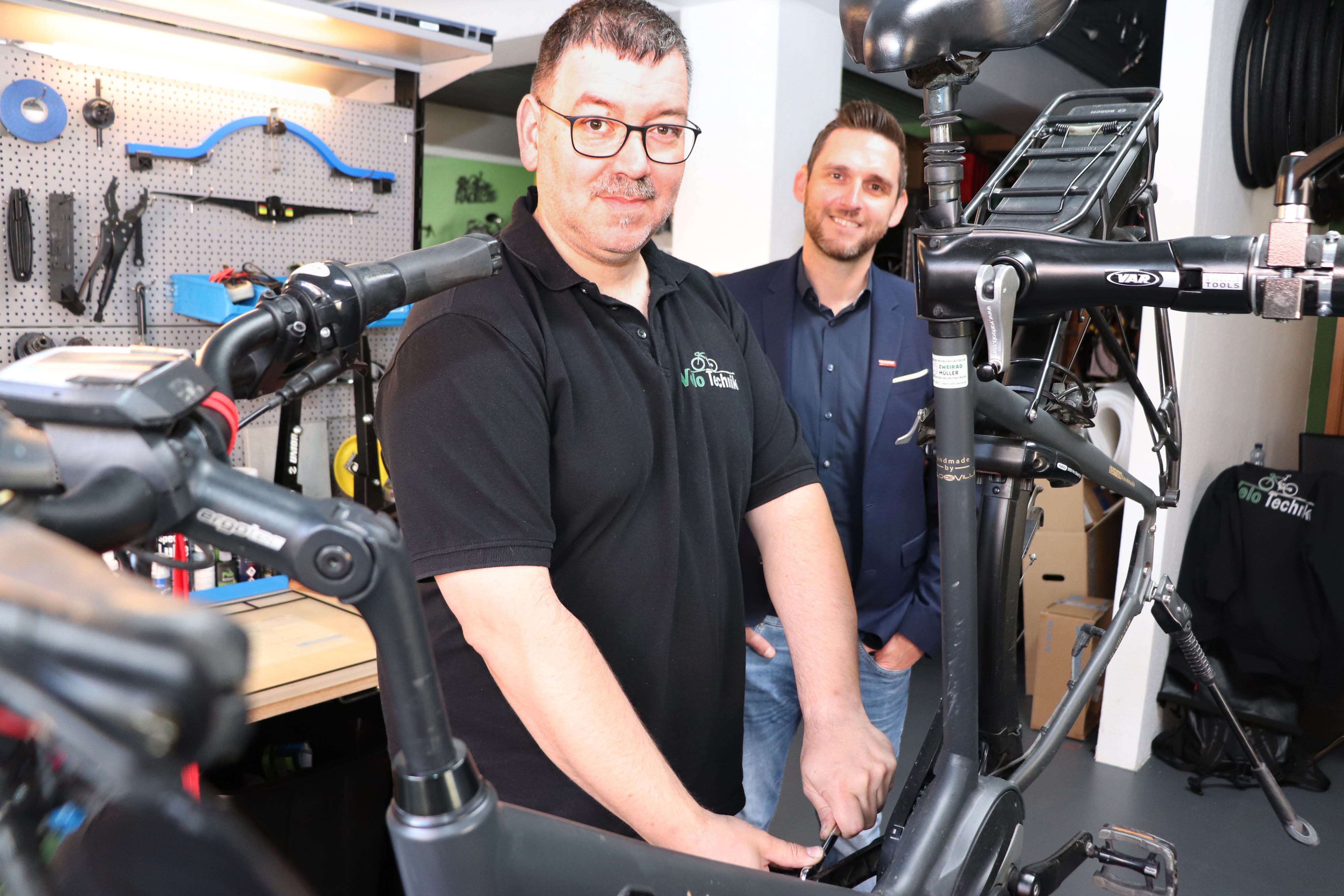 Stolz auf das Erreichte: Der neue Meister Sascha Spies vor seinem Zweiradshop Velo Technik in Großefehn mit Betriebsberater Julian Berghem